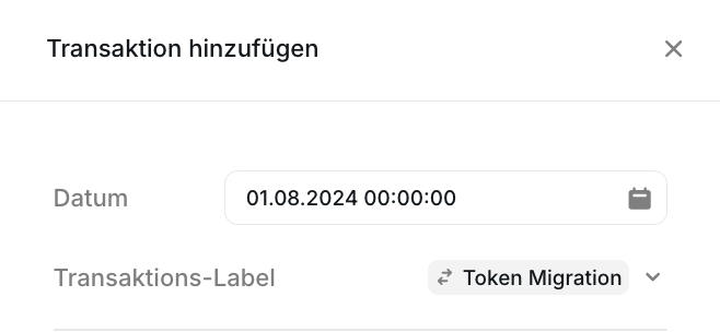 Das Label Token Migration steht aktuell ausschließlich für Assets des Typs "Krypto" zur Verfügung. Die Unterstützung weiterer Asset Typen wie etwa "Derivate/Stocks" bzw. die vollständige Darstellung von Stock Splits mittels Label Token Migration ist geplant. Bitte verwende in diesem Fall alternative Workarounds, um deinen Stock Splits darzustellen, bis das Label für diese vollständig unterstützt wird.