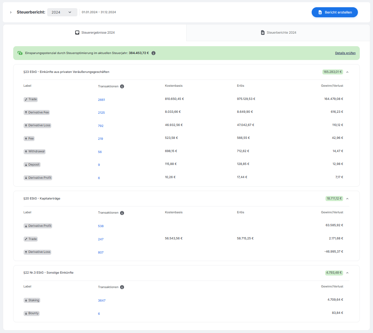 - Filtern der Transaktionen pro Steuer-Typ in auf der Transaktionen-Seite für freigeschaltete Steuerjahre (Kauf des Steuerberichts des entsprechenden Steuerjahrs notwendig)