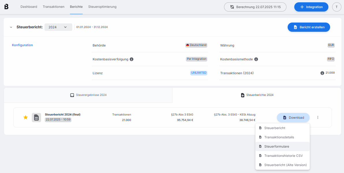 - Wurde die Berechnung erfolgreich abgeschlossen, stehen Steuerbericht, Transaktionshistorie sowie deine Steuerformulare über den Download Button zur Verfügung.