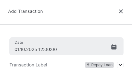 The transaction label Repay Loan is used to record outgoing assets or loan repayments that are to be sold at market value at the time of the outflow.